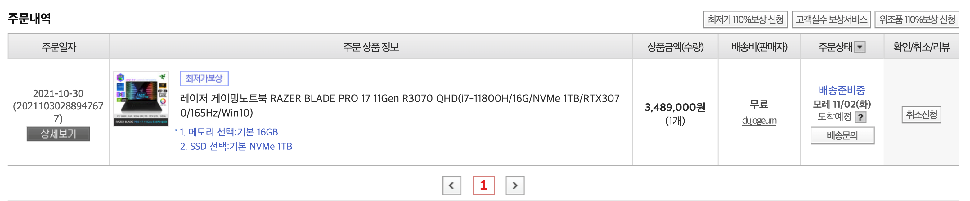 드디어 필자도 구매를 하였다. 저 배송준비중의 상태에서 조금만 기다리면 필자의 손안에 들어올 것이다. 15인치의 노트북을 쭉 써와본 느낌으로는 개발할때 너무 화면이 작다는 것이다. 또한 FHD의 환경에선 필히 외부 모니터를 연결해야 그나마 쾌적하다. 17인치를 선택한 이유가 바로 이것이다. 조금이나마 더 큰 화면과 더불어 2K의 해상도는 필자에게 더욱 많은 정보를 보여줄 것이다. 어서 다음주가 되어 필자의 품에 블레이드가 오길 기다릴 뿐이다. 다음주에는 언박싱을 하여 돌아오도록 하겠다.